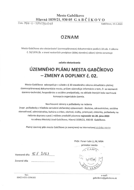 Oznámenie - začatie obstarávania uzemného plánu mesta Gabčíkovo - zmeny a doplnky č. 02.